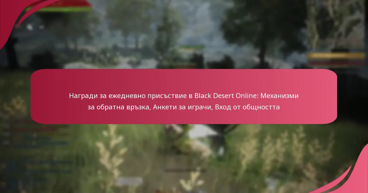 Основните анкети за играчи, свързани с наградите за ежедневно присъствие в Black Desert Online, се фокусират върху събиране на обратна връзка от общността, за да се подобри системата за награди. Тези анкети помагат на разработчиците да разберат предпочитанията на играчите и нивата на удовлетворение, което в крайна сметка влияе на бъдещите актуализации и корекции на структурата на наградите.