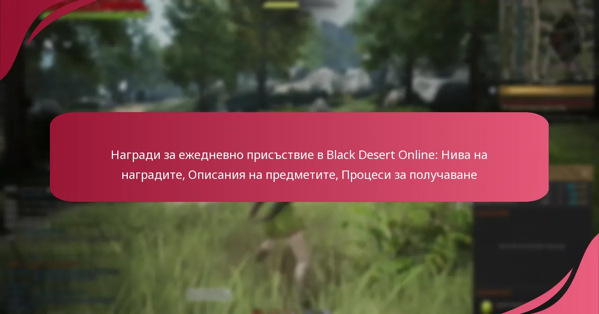 В Black Desert Online играчите могат да се възползват от Наградите за Дневно Присъствие, които включват множество нива, отключващи се при влизане в играта в последователни дни. Всяко ниво предлага все по-ценни предмети, включително ресурси и екипировка, които подобряват игровото изживяване. За да получат тези награди, играчите просто трябва да достъпят менюто за присъствие след влизане, като по-добрите предмети са налични за по-дълги серии на присъствие.